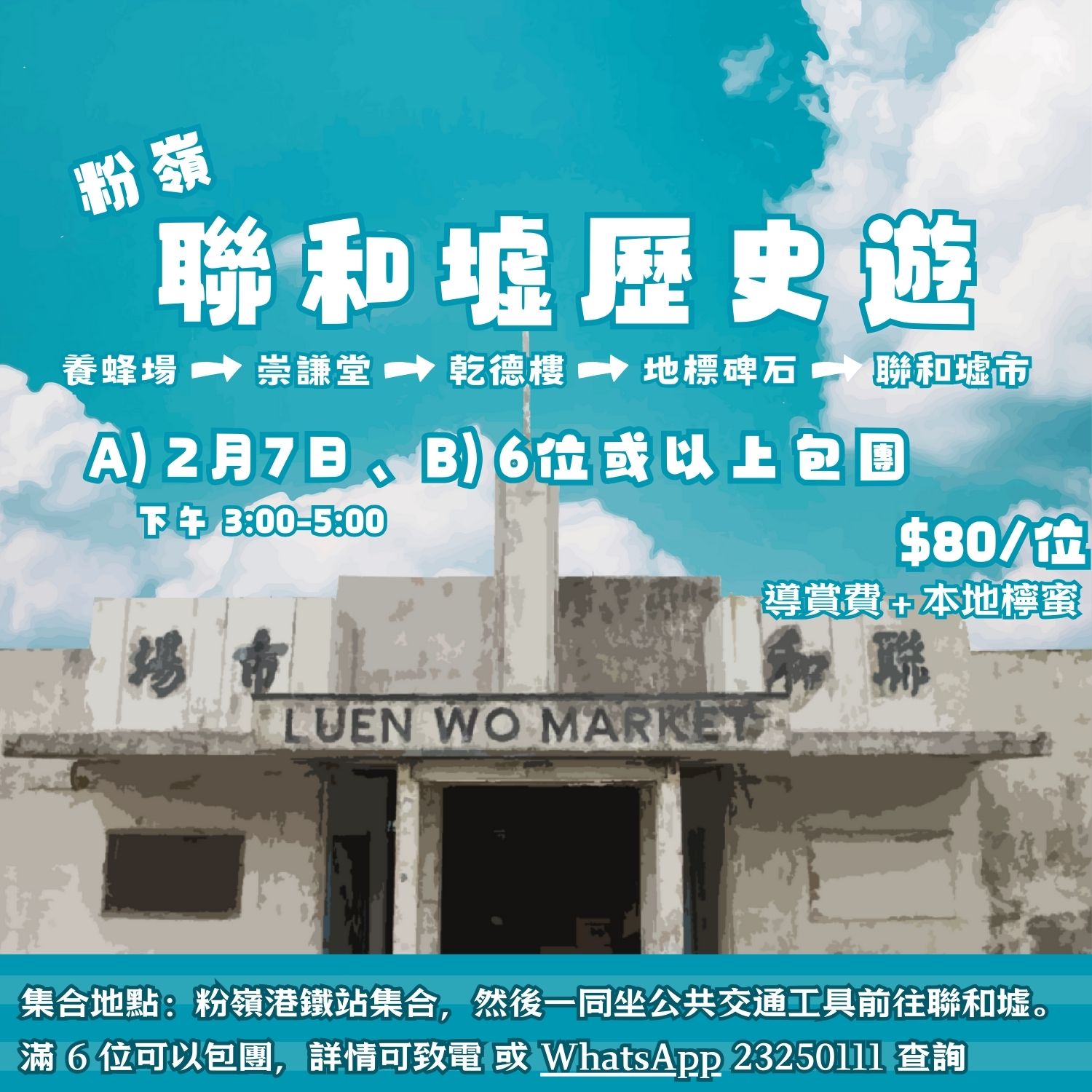 集合地點:粉嶺港鐵站集合,然後一同坐公共交通工具前往聯和墟。
